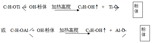 眾所周知,偶聯(lián)劑是改善有機(jī)高分子材料和無機(jī)填充材料界面特性的添加劑。從機(jī)理上講,偶聯(lián)劑分子中存在兩種性質(zhì)不同的基團(tuán):一種基團(tuán)和有機(jī)高分子材料有很好的相容性,能與高分子材料的長鏈進(jìn)行物理纏繞;另一種基團(tuán)則與無機(jī)粉體形成化學(xué)鍵,進(jìn)行多點(diǎn)錨固,即粉體表面微量的水份形成羥基與偶聯(lián)劑進(jìn)行化學(xué)吸附或化學(xué)反應(yīng)形成強(qiáng)有力的化學(xué)鍵,同時(shí)放出異丙醇。例如: