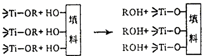 關(guān)于鈦酸酯偶聯(lián)劑的作用機理,一般認為是在單烷氧鈦酸酯偶聯(lián)劑中只有一個異丙氧基團是能和無機物偶聯(lián)的水解基團,因此就可以在無機顏、填料的表面形成單分子層(見下圖)